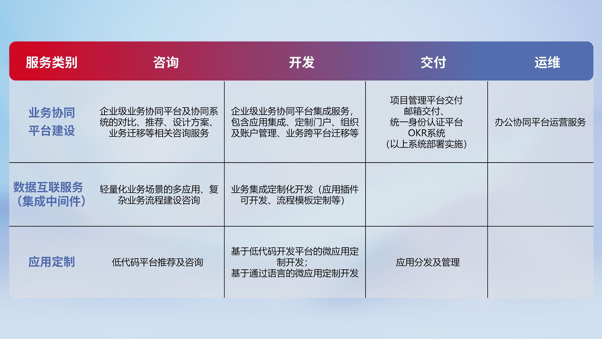 针对钉钉、、、、企微、、IDaas等平台级产品提供产品的规划、、、方案、、交付、、、、定制化开发等服务,,实现如统一协同办公、、、智能客户服务、、、、混合会议管理、、、智能数据查询、、、、等业务场景,,实现数字化转型。。。